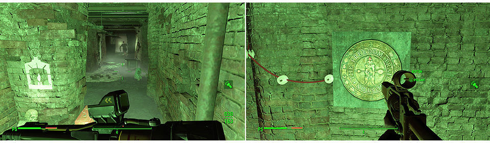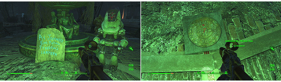Sobre un cartel en la fuente vemos "At Journey’s End Follow Freedom’s Lantern" y sobre la placa si la examinamos "7A", también hay un Robot con el que podemos recibir información sobre el Freedom Trail. Dde aquí tenemos que seguir el camino de baldosas marrones por diferentes ubicaciones hasta llegar a una iglesia. La primera parada en "Massachussets State House" encontramos en la placa "4L", el siguiente marcador lo encontramos en "Old Granary Burying Ground" pone "2A". Cuidado que hay varios necrófagos en esta ubicación. El siguiente marcador esta en "Old State House" pone "6O".