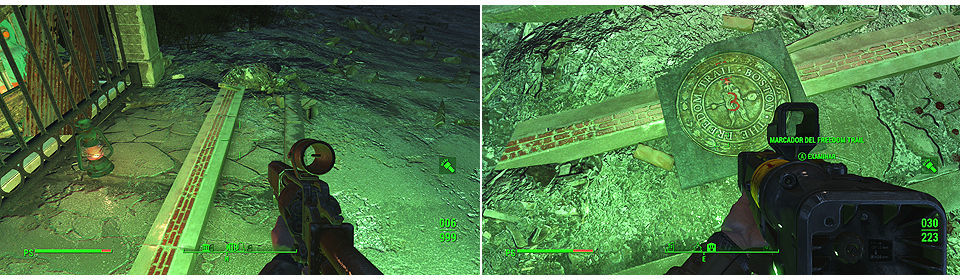 Continuamos, aquí el camino desaparece bajo los escombros, hay que seguir hacia el Noreste. El siguiente marcador lo encontramos detrás de un camión cisterna en "Old Corner Bookstore", pone "3I". En este tramo nos encontramos Supermutantes, Necrófagos y Saqueadores.