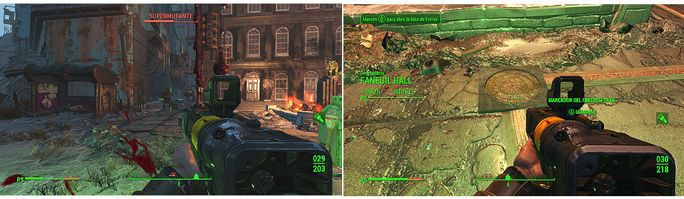 El siguiente lo encontramos en "Faneuil Hall", una zona ocupada por Supermutantes, cuidado con el Suicida y uno que esta apostado arriba con un Lanzamisiles, pone "5R".