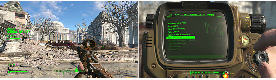 Siguiendo el consejo de Virgil, nos desplazamos hasta las ruinas del CIT en Cambridge, cuando lleguemos y cumplamos el objetivo nos piden que sintonicemos la radio con la frecuencia del Cazasynths, abrimos el Pip-boy y lo hacemos.