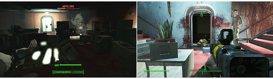 Llegamos a una sala con un láser trampa en medio, un Artillero y dos puertas. La de la derecha tiene una cerradura [Avanzada], dentro encontramos munición, una caja fuerte, un botiquín y un Terminal (podemos desactivar la trampa y abrir la caja fuerte desde hackeándolo). Continuamos por la puerta de enfrente, cuidado que hay unos cuantos Artilleros y una torreta según abramos la puerta (varios de ellos en posiciones elevadas). Cuando los eliminemos, subimos por el ascensor.