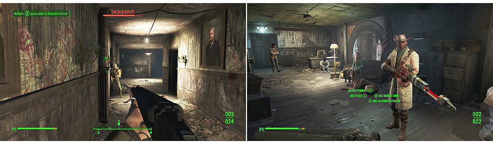 Tras Hackear el terminal y abrir la puerta conseguimos un "núcleo de fusión", seguimos avanzando subiendo por las escaleras rotas hacía el segundo piso, conviene registrar la zona a fondo, encontramos varios items por las salas, para avanzar continuamos por la puerta de la derecha, hay un pasillo con 2 saqueadores al fondo, los matamos y continuamos por el agujero de la pared, en el suelo donde les hemos matado hay una caja con cartuchos de escopeta, subimos hasta el tercer piso, aquí tenemos otros 2 saqueadores, recordemos que podemos enviar al perro para que los entretenga, al fondo encontramos a los colonos.