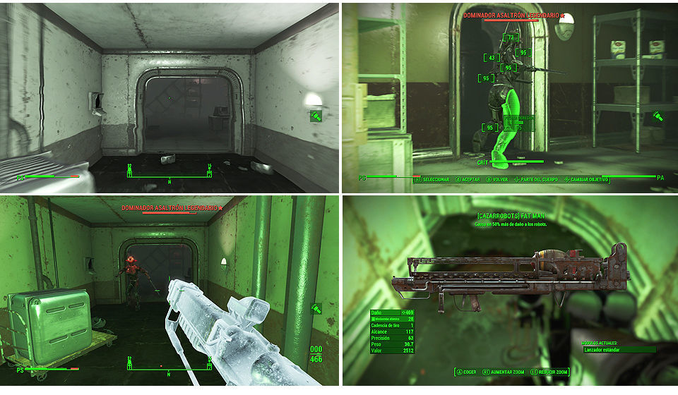 Al abrir la puerta tenemos un gran problema, un Dominador Asaltrón Legendario, muchísimo cuidado con este enemigo. Nos matará muy rápidamente en cuanto nos detecte (aparte de que se camufla), lo mejor que podemos hacer para matarle es usar un Stealth Boy si lo tenemos o intentar pasar desapercibidos y con el arma más potente que tengamos romperle las piernas. También podemos colocar minas por la zona, una vez que consigamos destruirle las piernas será más sencillo acabar con él, aunque todavía sigue siendo muy peligroso. Mucho cuidado con el rayo de su ojo, registrando su cuerpo al matarle podemos encontrar el arma "[Cazarrobots] Fat Man" y unas Minibombas Atómicas.
