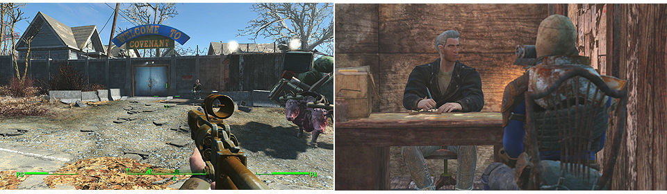 En Covenant debemos hablar con los colonos para recabar información sobre la caravana y el problema con los Synths. Talia Mcgovern, la mujer que esta en el banco de trabajo y Penny Fitzgerald, la camarera (nos habla sobre el "Complejo"), pueden darnos pistas, también podemos hablar con Jacob Orden el alcalde de Covenant.