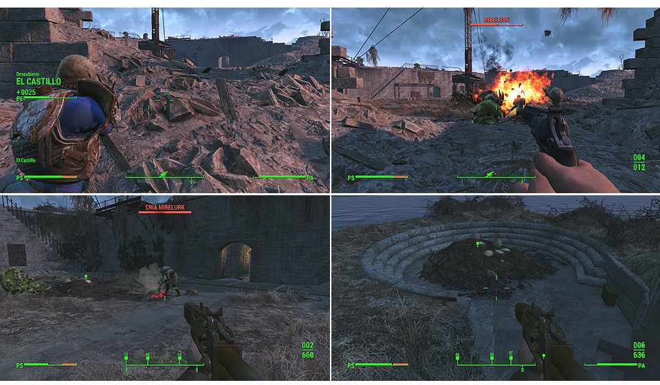 El Castillo esta lleno de Mirelurks, estos enemigos tienen caparazón. Las armas láser les hacen buen daño, y contamos con la ayuda de los MinuteMen. También los cócteles molotov o el lanzallamas vienen bien. Cuando acabemos con todos veremos que los Mirelurks han anidado en el lugar y la zona está llena de nidos con huevos. Hay que destruir tantos como podamos hasta que un temblor avise de la llegada de un nuevo enemigo. Al romper los huevos normalmente salen un par de crías, eliminarlas rápido o luego nos molestarán bastante.