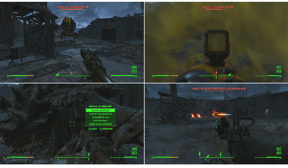 Aunque su chorro llega muy lejos así que mucho cuidado si nos encara. Los disparos con crítico nos van a venir bien, aparte de llevar un arma con gran poder de ataque como un lanzamisiles o si tenemos un Fat o Big Boy mucho mejor. Otro detalle a tener en cuenta es que además de la reina algún que otro Mirelurk y crías están por la zona tocando las narices. Pero uno de ellos en concreto es incluso más complejo que la propia Reina, un Mirelurk Resplandeciente Legendario. Mucho cuidado con este enemigo, tiene mucha resistencia, aunque sus ataques no son tan peligrosos como los de la Reina, no parará de atacarnos violentamente hasta morir.