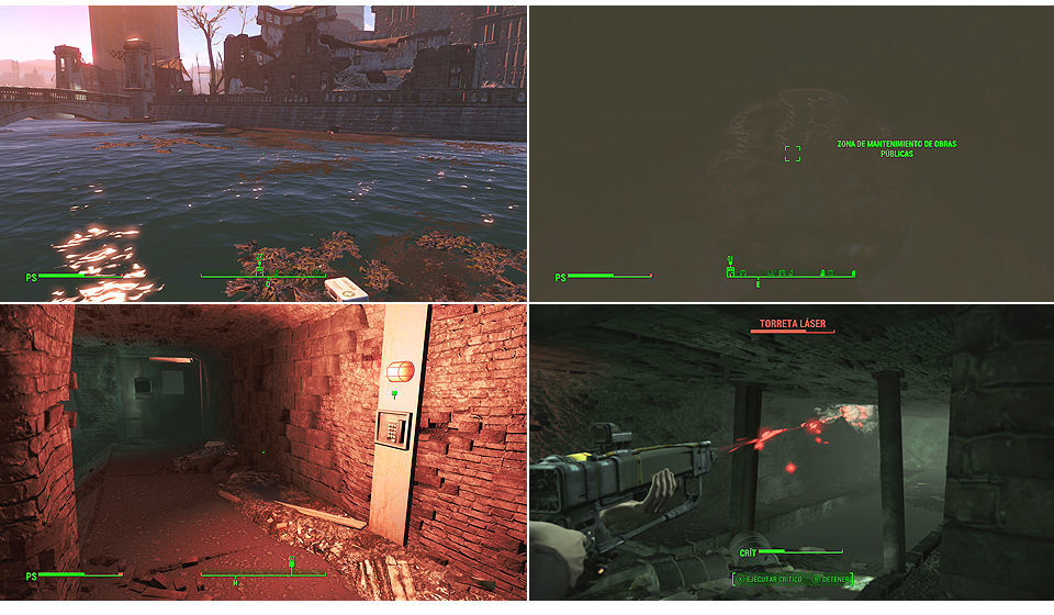 Una vez dentro accedemos al teclado numérico en la columna para desbloquear otro túnel bajo el agua. También tenemos un terminal que abre una puerta para coger ítems, lo cogemos todo y nos tiramos por el túnel cayendo a una sala amplia con columnas. Cuidado al avanzar con las 2 torretas láser en el techo, quitan mucha vida.