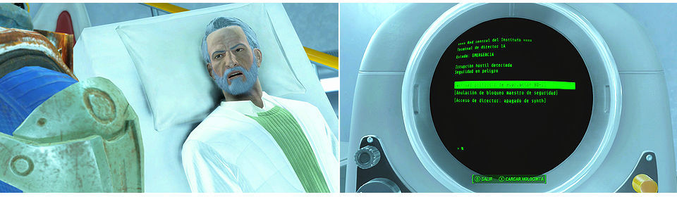 Mediante el ascensor llegamos hasta Padre esta en una cama, y a la izquierda tiene el terminal para poder anular el Bloqueo de Seguridad y abrir el camino hacia Sistemas Avanzados. Volvemos al vestíbulo donde nuevamente tendremos resistencia Synth.
