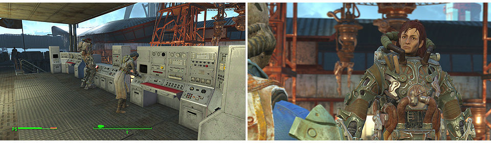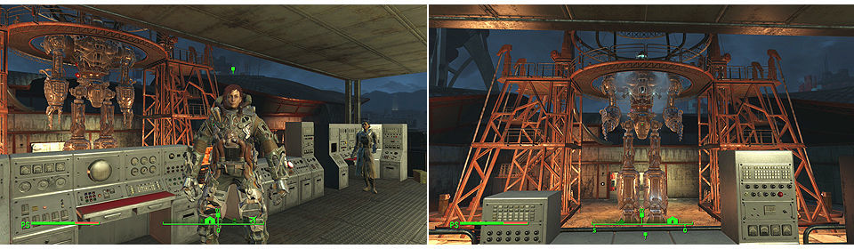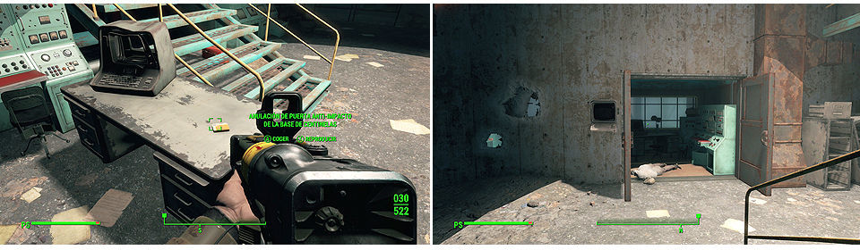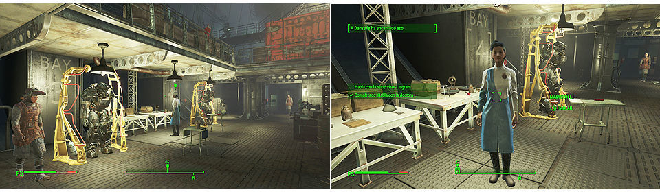 Una vez que consigamos entrar veremos todo el arsenal de bombas Mark 28, colocamos el emisor de emergencia sobre la grúa de la izquierda y si vamos con el Paladín Danse de compañero le informamos. Si no, tendremos que ir hasta el Prydwen para hablar con él. Para salir rápido del complejo a la derecha del almacén tenemos una plataforma que nos lleva hasta la parte de arriba y salir al exterior, cuidado que al bajar hay un Resplandeciente.