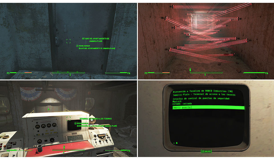 Bajamos y vamos por la zona de la izquierda, aquí encontraremos el terminal de la alcaldía, con la contraseña de la alcaldesa podremos desbloquear la caja fuerte que hay en la pared, lo cogemos y bajamos hasta llegar a la puerta que conduce al sótano y podemos abrir con la Llave de Jamaica Plain, tras avanzar por una puerta doble y desbloquear la cerradura [Maestro] de la izquierda (por la derecha hay unos lásers y unas torretas que tendremos que destruir si queremos pasar por aquí) llegaremos hasta el terminal de acceso a los tesoros, con la Contraseña de la alcaldesa lo desbloquearemos sin problemas y abriremos las puertas magnéticas.