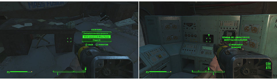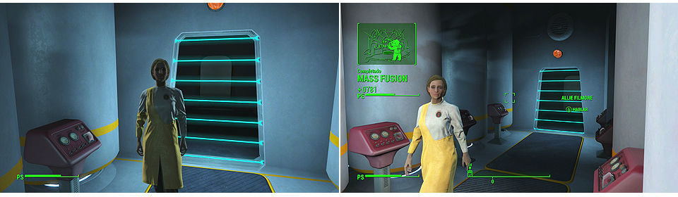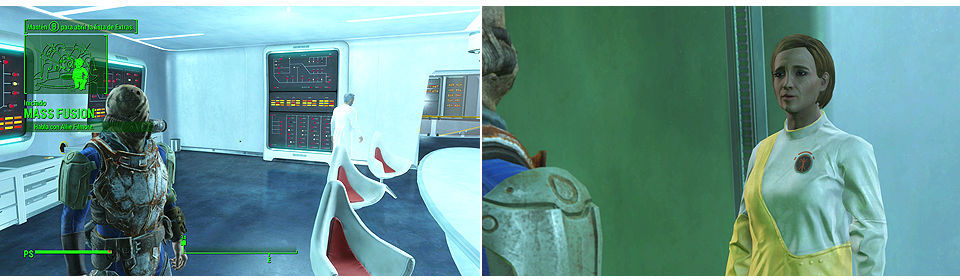 Según nos teletransportemos hasta Mass Fusion, un Caballero y varios miembros de la Hermandad nos estarán esperando. Allie nos ayudará a eliminarlos si la dejamos que nos acompañará. Cuando matemos a todos, tenemos que llegar hasta un terminal [Avanzando] subiendo las escaleras, en un escritorio en una sala anterior a la del terminal podemos coger la contraseña para acceder al terminal sin tener que hackearlo y una ID de ejecutivo de Mass Fusion para activar el ascensor.