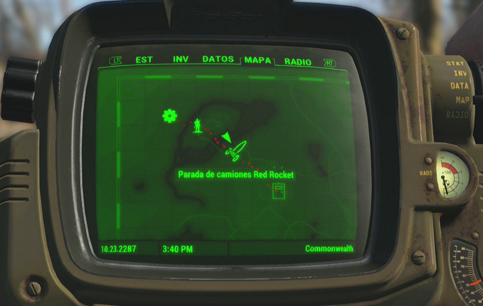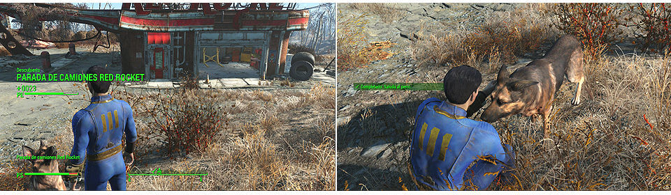Nos dirigimos hacia el Sur, en el trayecto hacia Concord, nos encontramos con la Parada de Camiones Red Rocket, aquí veremos a un perro solo, le saludamos para que venga con nosotros y completamos el tutorial sobre como darle órdenes.