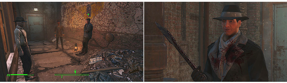 Le encontramos en el callejón a la izquierda de Memory Den, podemos atacarle directamente cuando le veamos o hablar con él. No es muy peligroso, acabamos con él y poniéndonos junto a su cadáver con Y/Triángulo dejamos una Tarjeta de visita de Mortaja Plateada sobre su cuerpo.