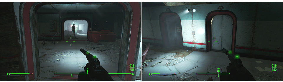 Nos ponemos en marcha y entramos en el hospital, según entramos por la derecha tenemos una puerta con una trampa y por la izquierda una puerta grande con Saqueadores al otro lado. Los eliminamos, cuidado que puede venirnos otro por detrás, por esta zona tenemos un ascensor, lo cogemos y bajamos.