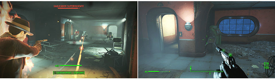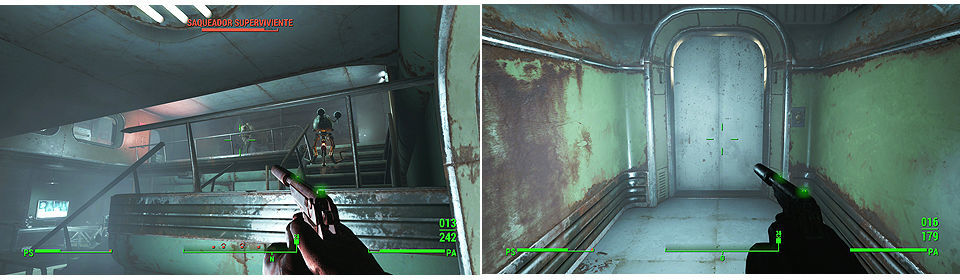 Al salir del ascensor bajamos por las escaleras de la izquierda y avanzamos hasta una sala donde hay una torreta, varios Saqueadores arriba y un robot "Enfermera Mañosa". Cuidado que varios de los enemigos son Saqueadores Supervivientes y son duros, los eliminamos a todos, subimos por las escaleras y continuamos hacia el objetivo llegando hasta otro ascensor que sube al segundo piso.