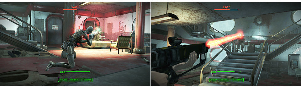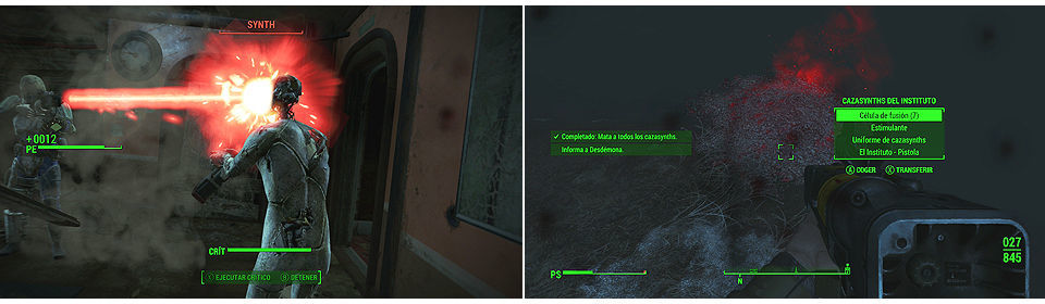 Ahora nos queda otro objetivo que eliminar, para bajar lo hacemos por el agujero en el suelo en el piso donde nos encontramos con X9-27. Bajamos hasta dar con el otro Cazasynths, durante el camino nos cruzaremos con alguna torreta ametralladora y con mas Synths de primera generación. Los eliminamos a todos, en una máquina de Nuka-Cola tenemos 2 Nuka-Colas Quantum cuando lleguemos hasta la posición del Cazasynths igual, cuidado con su camuflaje.
