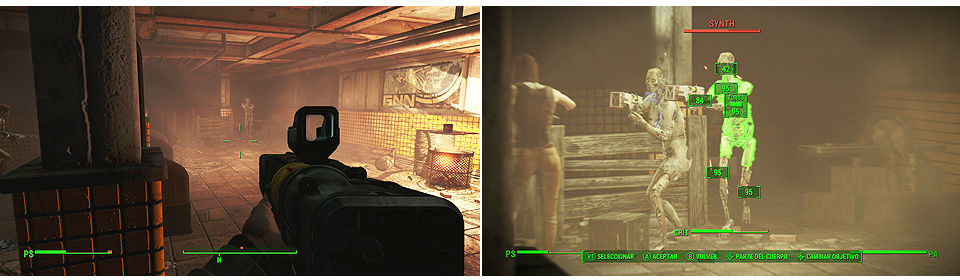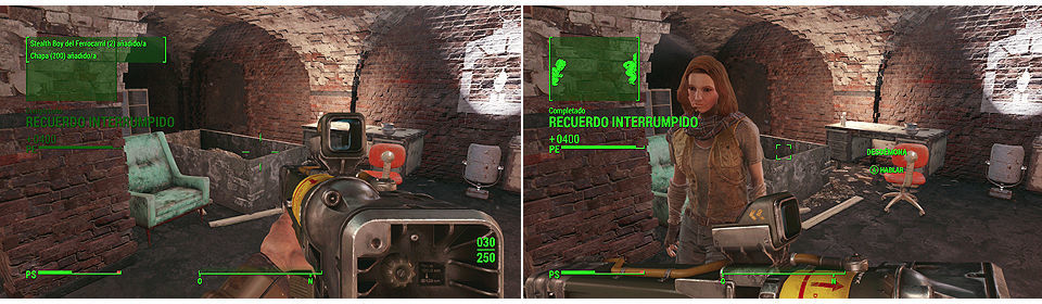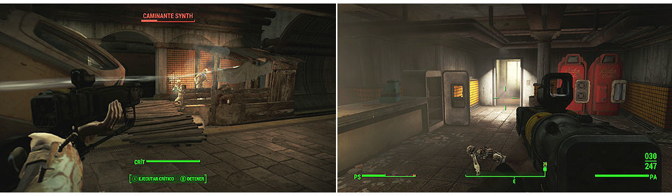 Según entremos a la estación, al bajar las escaleras ya nos encontramos un par de Synths y una puerta cerrada con cadena a la derecha. Aquí el objetivo no tiene ubicación, simplemente hay que eliminar a todos los enemigos Synths del lugar, también la zona esta llena de cadáveres de saqueadores, conviene registrarlos en busca de munición y estimulantes.