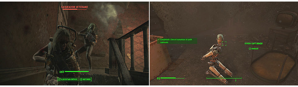 Nos dirigimos hasta la ubicación señalada, en este caso "Cubil de Drogas" y eliminamos a todos los Saqueadores que encontremos. En el objetivo encontraremos a un Synth, le damos el transmisor para que un Cazasynth venga a recogerle y nos vamos.