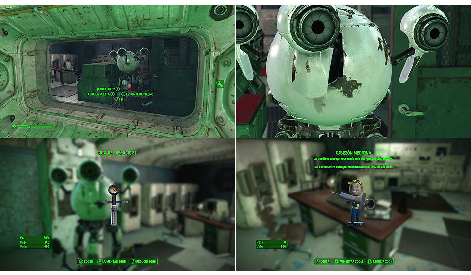 Avanzando veremos una puerta corredera que esta bloqueada, dentro esta el objetivo un robot como nuestro amigo Codsworth. "Curie" solo abrirá la puerta si hemos eliminado a todas las ratas topo, cuando lo hagamos hablamos con ella y le seguimos la corriente para que nos abra la puerta y nos entrega "Cura del Refugio 81". Pero antes de irnos en la sala donde esta Curie no se nos olvide coger sobre la mesa el Cabezón "Medicina" (los estimulantes curan permanentemente un 10% más de daño).