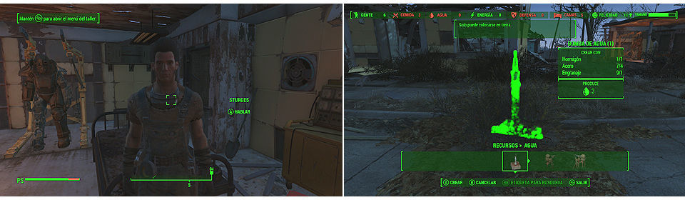 Tras construir las camas volvemos a hablar con Sturges, ahora nos pide que proporcionemos agua al asentamiento, hay que crear 2 bombas de agua para que nos den el objetivo por completado, desde el menú del taller, Recursos-Agua.