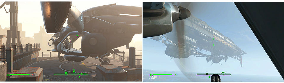 Hablamos con Danse en la comisaría, nos pedirá que le acompañemos al Prydwen y que nos espera en la azotea de la comisaría para subir a un Vertibird. Una vez que subamos volamos hacia el Aeropuerto de Boston donde está la nave insignia de la Hermandad, el Prydwen.