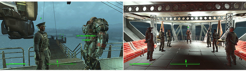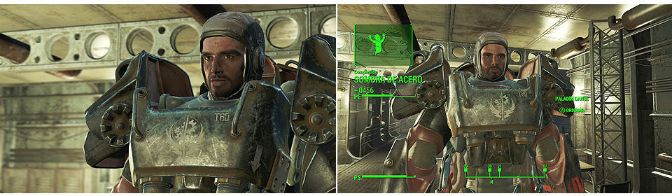 Subimos a la cubierta principal del Prydwen, aquí tenemos 4 niveles: en el nivel 2 empezando desde abajo encontraremos las estaciones de Servoarmaduras, donde nos espera una T-60 de la Hermandad para nosotros, también podemos ir a abrir un contenedor personal (lo encontraremos en Misiones/Varios). Hablamos con Danse para finalizar la misión y comenzar "Ruta de Servicio", también desbloqueamos a Danse como compañero.