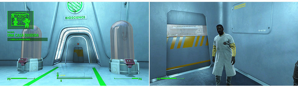 El acceso principal a Biociencias esta cortado tenemos que continuar por la puerta de la derecha, nos encontraremos un par de Synths hostiles y dos torretas, al llegar a la sala de observación podemos hablar con el doctor Higgs, la situación no va a resolverse por si sola y algo tendremos que hacer.