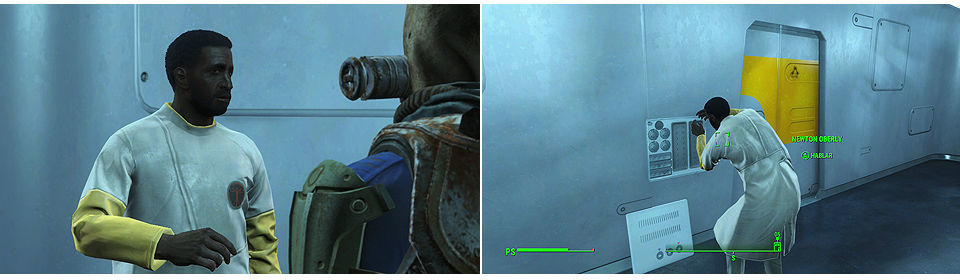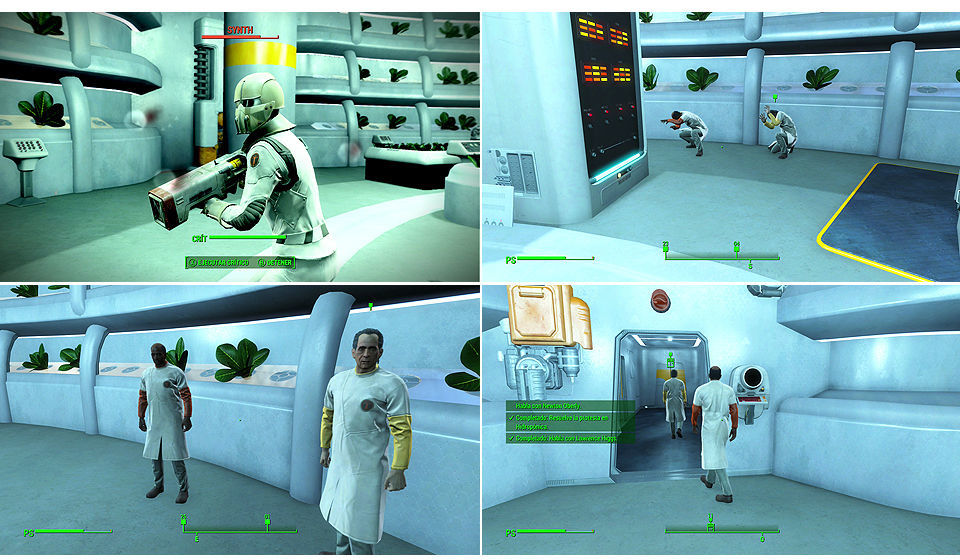 - Abrir la puerta a Hidropónica y eliminar a los Synths de seguridad sin atacar a los doctores Higgs y Loken una vez acabemos con los enemigos hablamos con Higgs y les persuadimos para que pongan fin a la revuelta y abran la puerta.