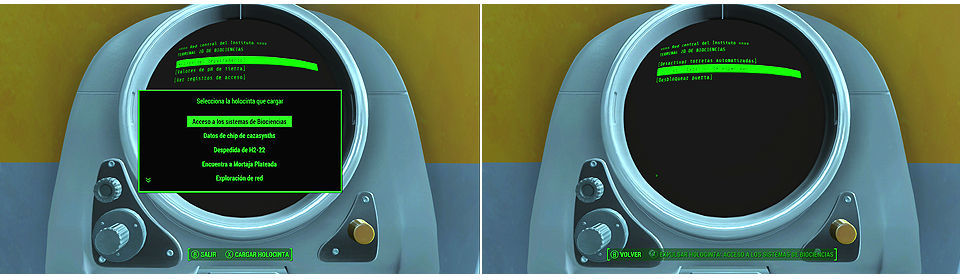 Desde cualquiera de los dos terminales que tenemos en la sala de observación podemos cargar la holocinta "Acceso a los Sistemas de Biociencias" que nos ha dado el doctor Oberly podemos tomar 2 decisiones aparte de desactivar las torretas.