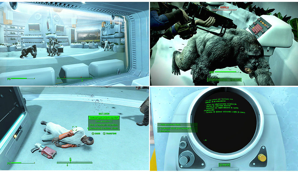 - Liberar a los especimenes Gorilas, acabarán con los doctores y los Synths, luego tendremos que acabar con ellos, del cadáver de Max Loken cogemos la contraseña para anular la seguridad y lo utilizamos en el terminal a la entrada de la sala de Hidropónica.