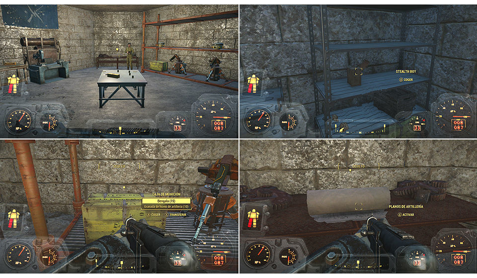 Una vez dentro del arsenal, Ronnie nos pide que cojamos los planos de artillería y todas las granadas de humo, pero además encontramos un montón de cosas más: Minibomba atómica, Mosquestes lásers mejorados, Stealth Boy (nos hace invisibles), módulos para los Mosquestes, un Fat Man y municiones. Cuando cojamos todo lo que nos interese, cogemos los planos y las granadas de humo ( a la derecha de los planos en una caja de madera) y salimos a hablar con Ronnie.