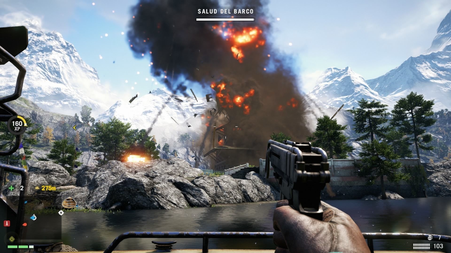 Cuando pongas todas las bombas sal corriendo a la lancha, el templo caerá. La huida no será segura por los enemigos en las orillas y un helicóptero, pero puedes usar la torreta de tu barca para un mayor poder de ataque –y munición infinita-. Llega a salvo a tierra para concluir la misión.