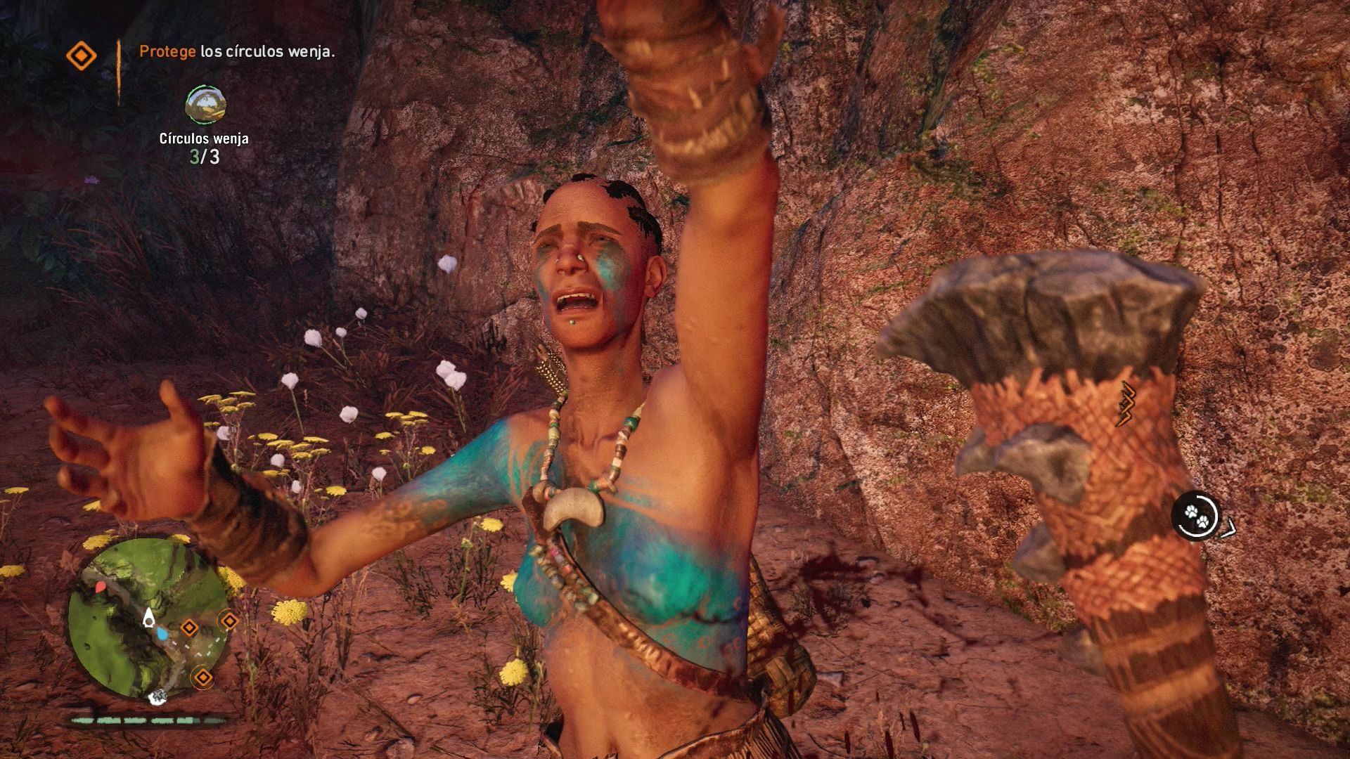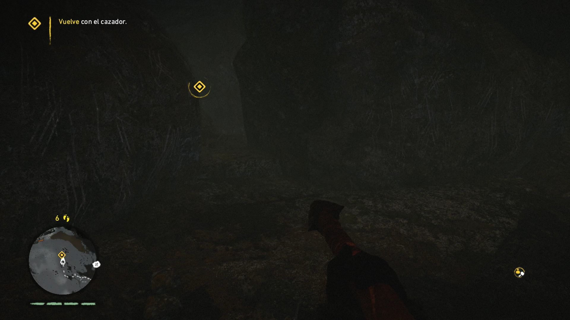 Usa la visión de cazador para seguir el rastro del cazador Wenja hasta una cueva. En la cueva te enfrentarás a varios tigres con los debes acabar para asegurar la zona. Examina los restos que ves por la zona en busca de objetos y sigue el rastro de las pisadas de sangre hasta encontrar al cazador Wenja en una pequeña grieta de la pared.