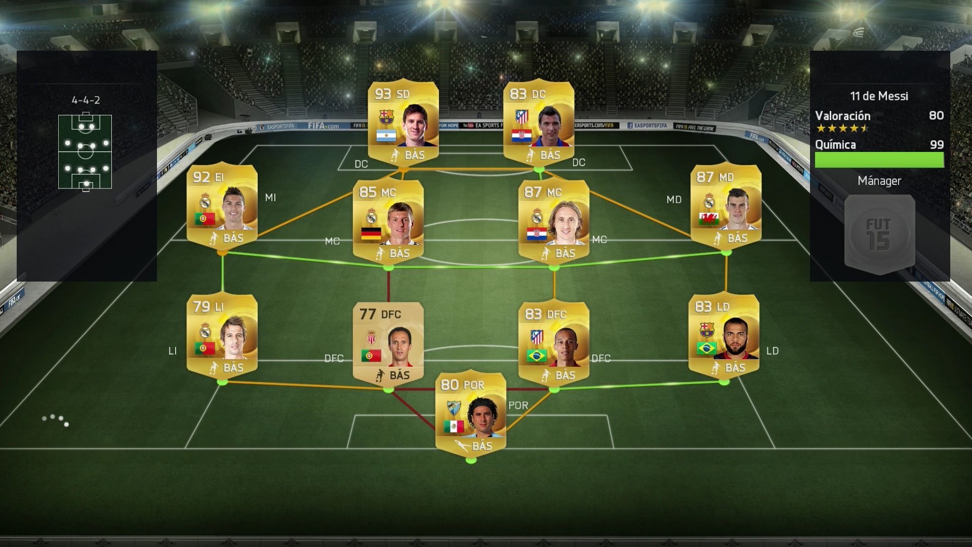 La Valoración de Química de tu equipo aparece en la esquina superior derecha cuando ves tu Plantilla activa, y se puede mejorar si colocas a los jugadores en sus posiciones preferidas, o si los vinculas adecuadamente. Para mejorar la Química (hasta un máximo de 100), tienes que tener en cuenta los parámetros Nacionalidad, Liga y Club. Las líneas verdes indican que los vínculos entre los jugadores son fuertes, y estos se establecen si los jugadores son del mismo país, juegan en la misma liga o pertenecen al mismo equipo. Cambia a los jugadores en la pantalla Plantilla activa y añade otros nuevos de tu Club o del Mercado de transferibles, hasta que encuentres el equilibrio ideal para tu equipo.