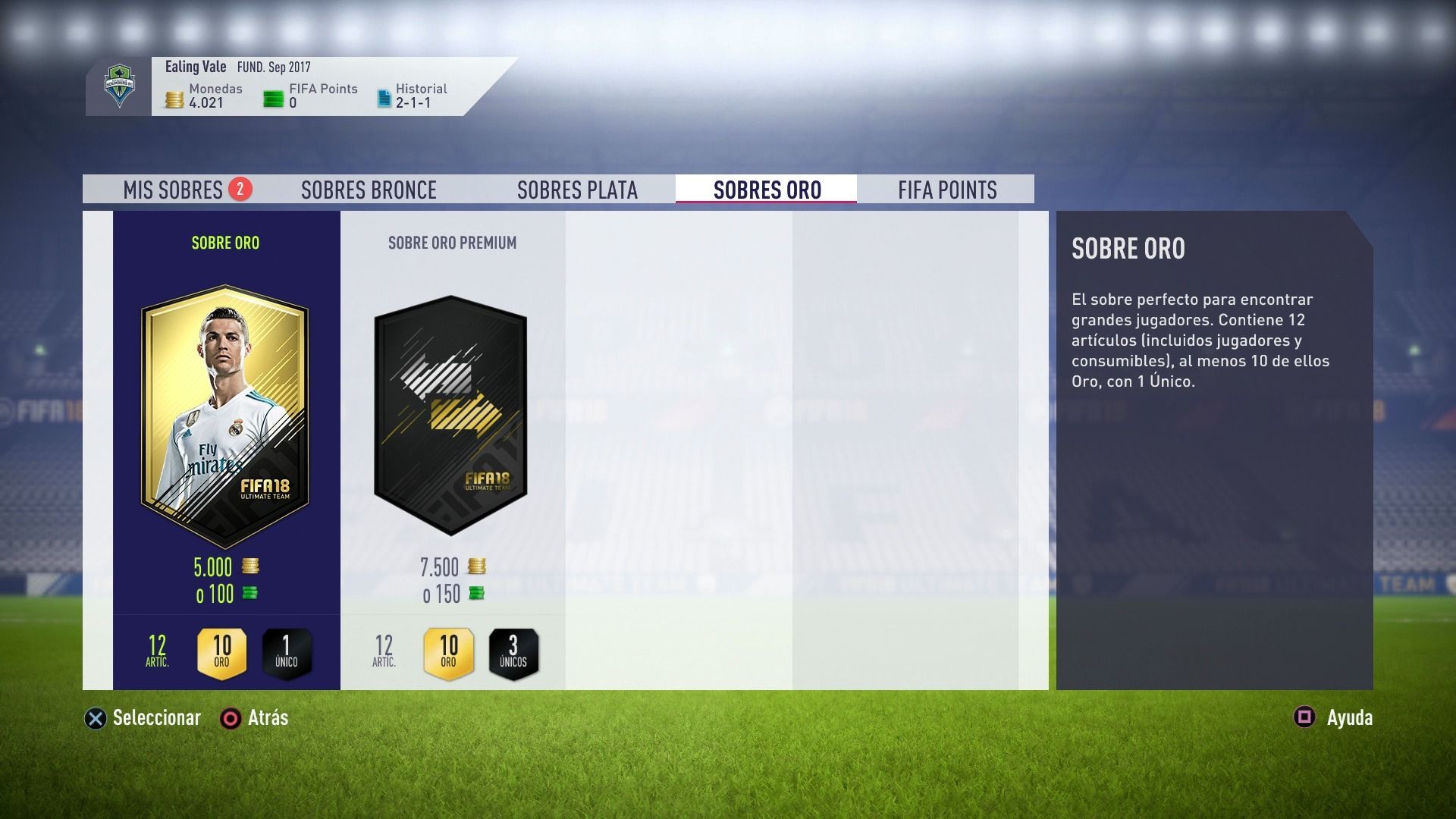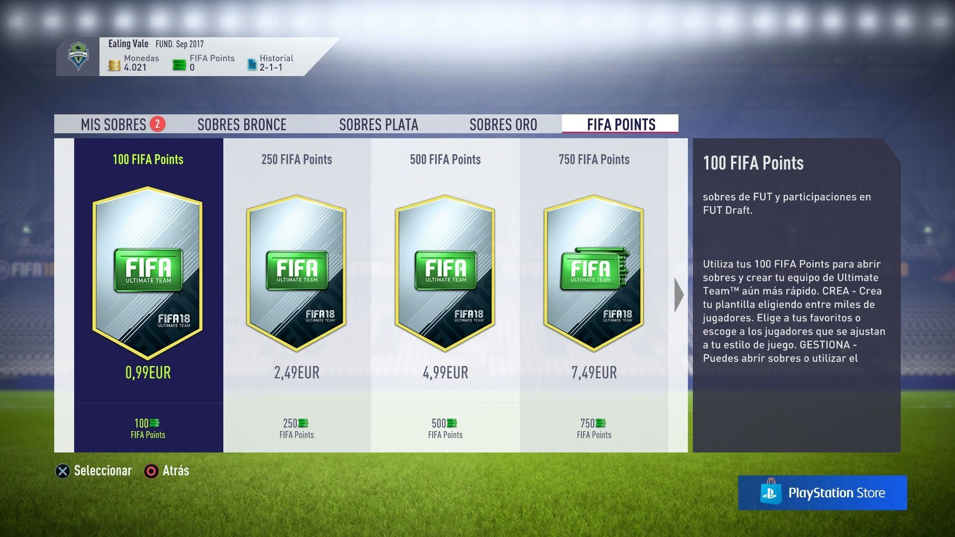 Por ejemplo un sobre de oro de FUT se puede comprar con 5000 monedas de oro o 100 FIFA Points, y un sobre de plata por 2500 monedas de oro o 50 FIFA Points (los sobres de bronce no pueden adquirir con FIFA Points).