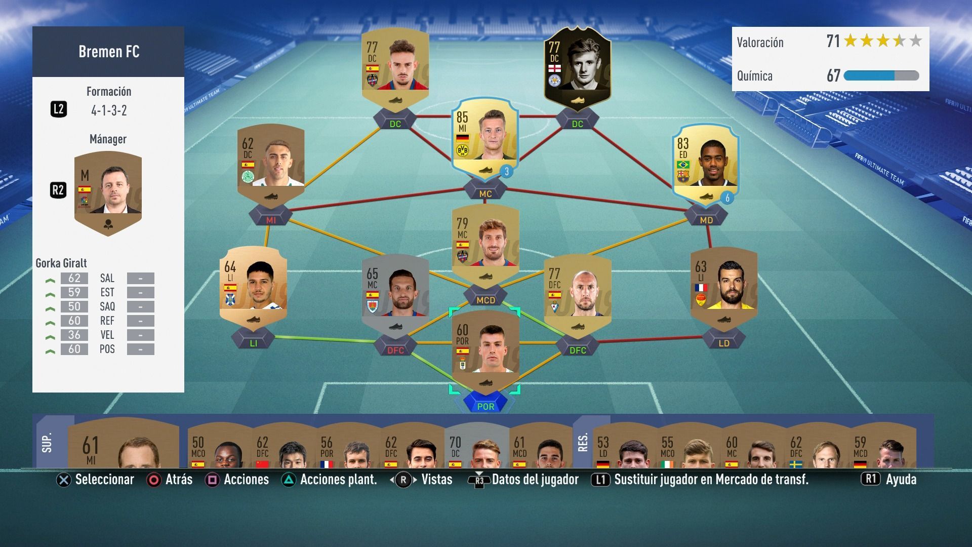 Lo primero es elegir entre una de las cinco formaciones disponibles, definiendo aquí nuestro estilo de juego. Al empezar habrá que nombrar un capitán que será el primer miembro del equipo. Después comenzará la fase de selección donde habrá que elegir en cada posición entre los cinco futbolistas que nos ofrecen hasta formar una plantilla con 23 jugadores. Lógicamente, en nuestra selección habrá que tener muy en cuenta: calidad, nacionalidad, liga o estilo.