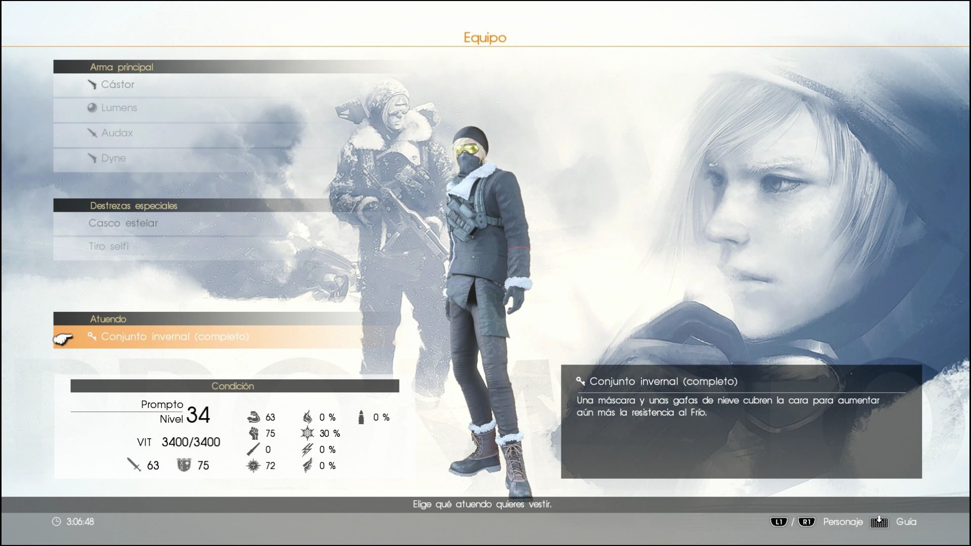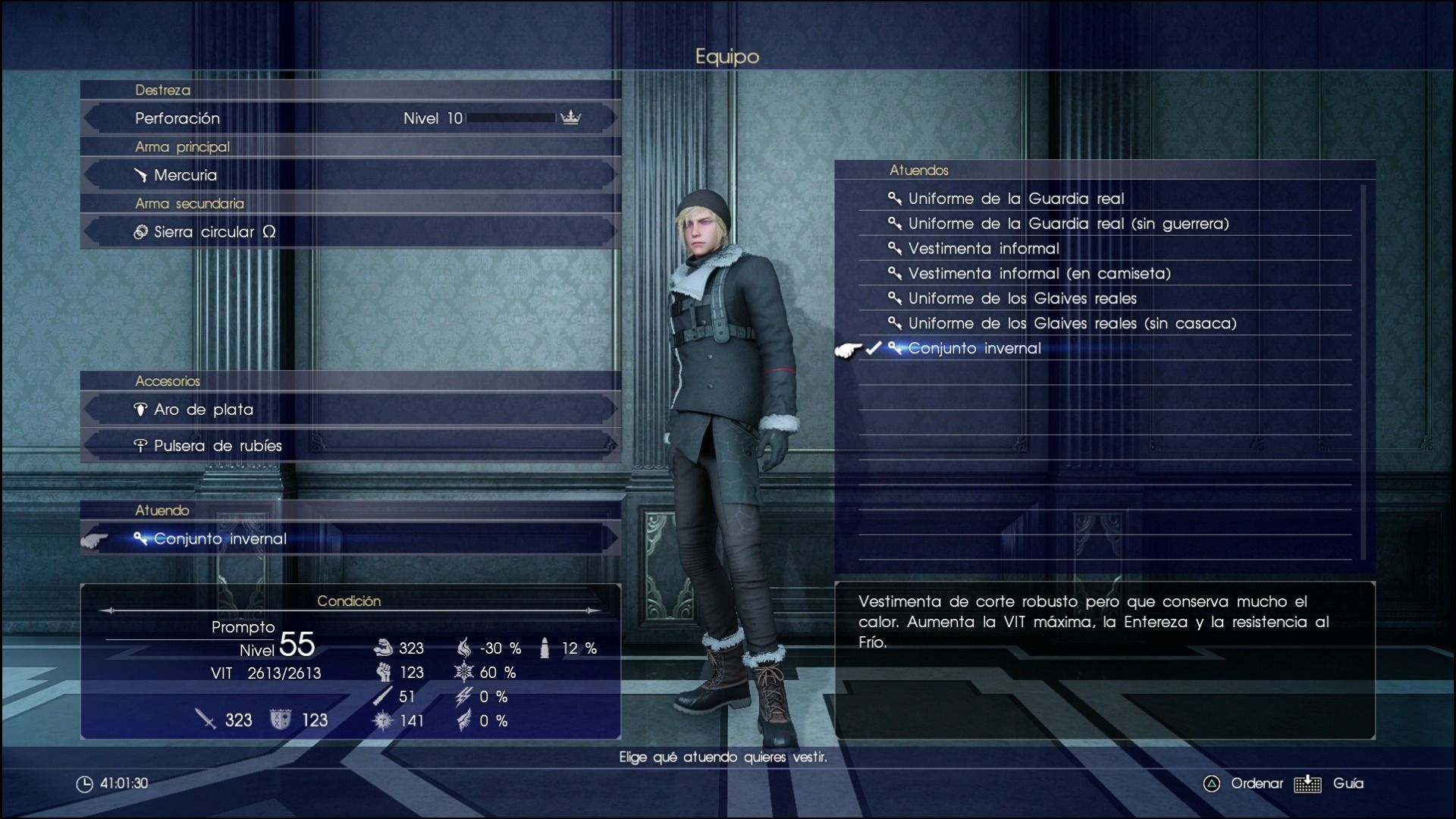 - Atuendo Conjunto invernal para Prompto: una vestimenta que solo se puede equipar Prompto, de corte robusto pero que conserva mucho el calor. Aumenta la vitalidad máxima, la entereza y la resistencia al frío.