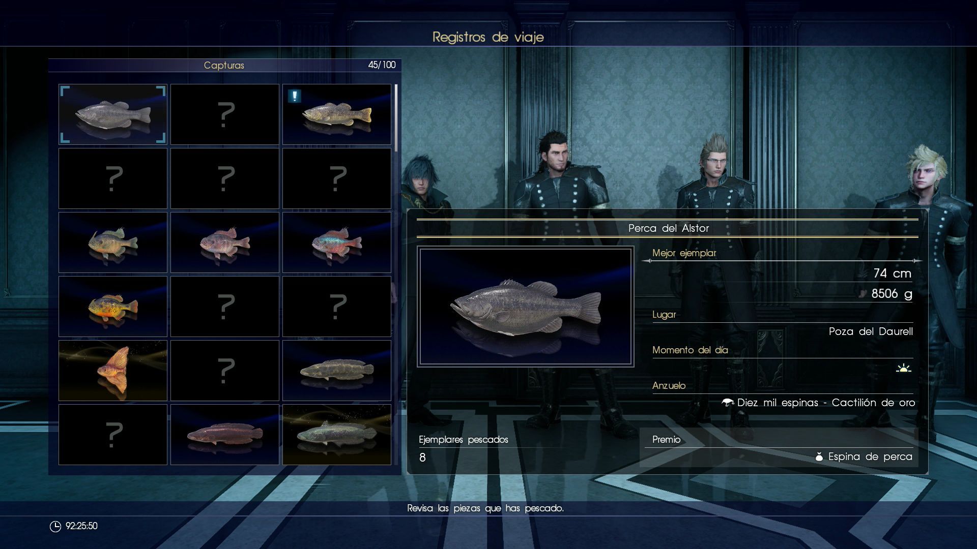 Llegar a pescarlos todos no nos otorga ningún tipo de recompensa pero si el llegar al nivel 10 de pesca. Las misiones secundarias de Navyth nos otorgarán un par de recompensas.