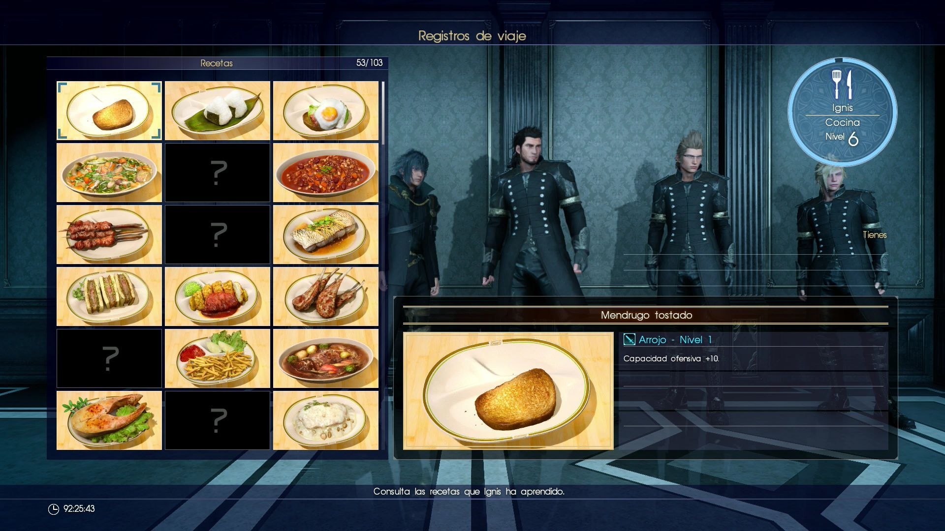 Otro de los retos seria Ignis aprenda las más de 100 recetas que tiene el juego. Para que las aprenda tendrás que vivitar cada uno de los restaurantes del juego para probar todos sus platos, completar ciertas misiones secundarias, completar batidas de caza, recolectar al menos una vez todos los tipos de plantas que están repartidas por todo Lucie y finalmente conseguir el nivel 10 de cocina.
