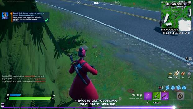 Para completar esta misión, busca un pollo, jabalí, lobo dinosaurio o tiburón y usa un gesto cerca de él. La completarás al instante.