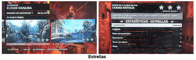 La campaña ahora se divide en secciones, en cada una de ellas podemos conseguir un máximo de 3 estrellas, en total hay 126, según las bajas que consigamos, ejecuciones, insignias, completar las misiones clasificadas, se nos irá llenando el marcador y al final de cada sección se nos otorgarán las muertes y caídas descuentan puntos, solo se marcan las estrellas en el nivel de dificultad mas elevado que hayamos jugado.