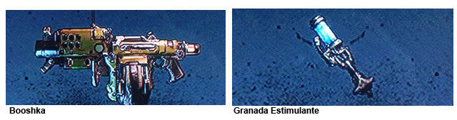 Booshka: Un lanzagranadas explosivo que dispara en arco y cuya munición puede rebotar en las superficies.