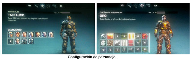 Configurar personaje: A medida que vayamos avanzando y consiguiendo cajas y estrellas iremos desbloqueando diseños para armas, trajes y personajes que desbloquear en el multijugador.
