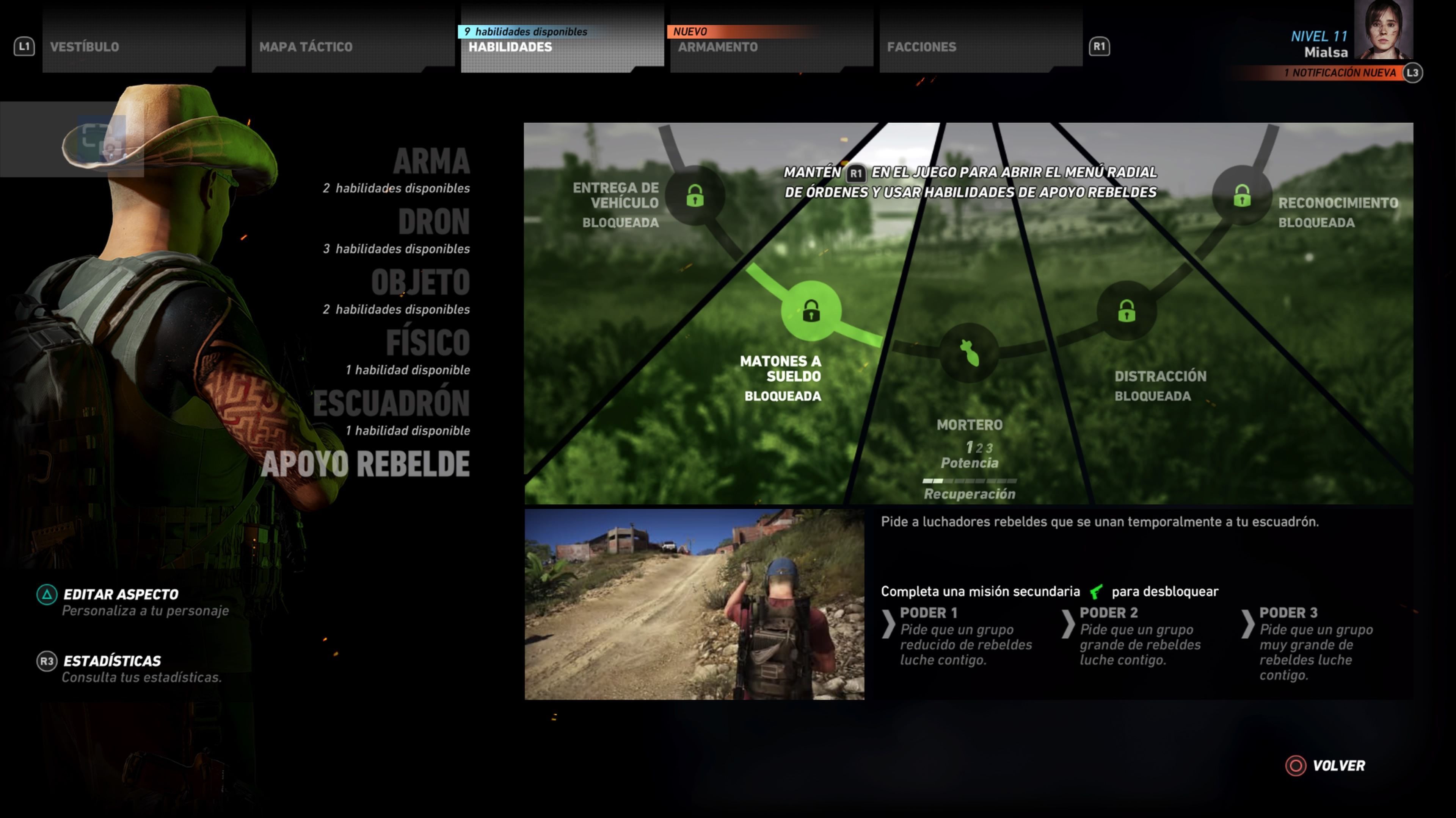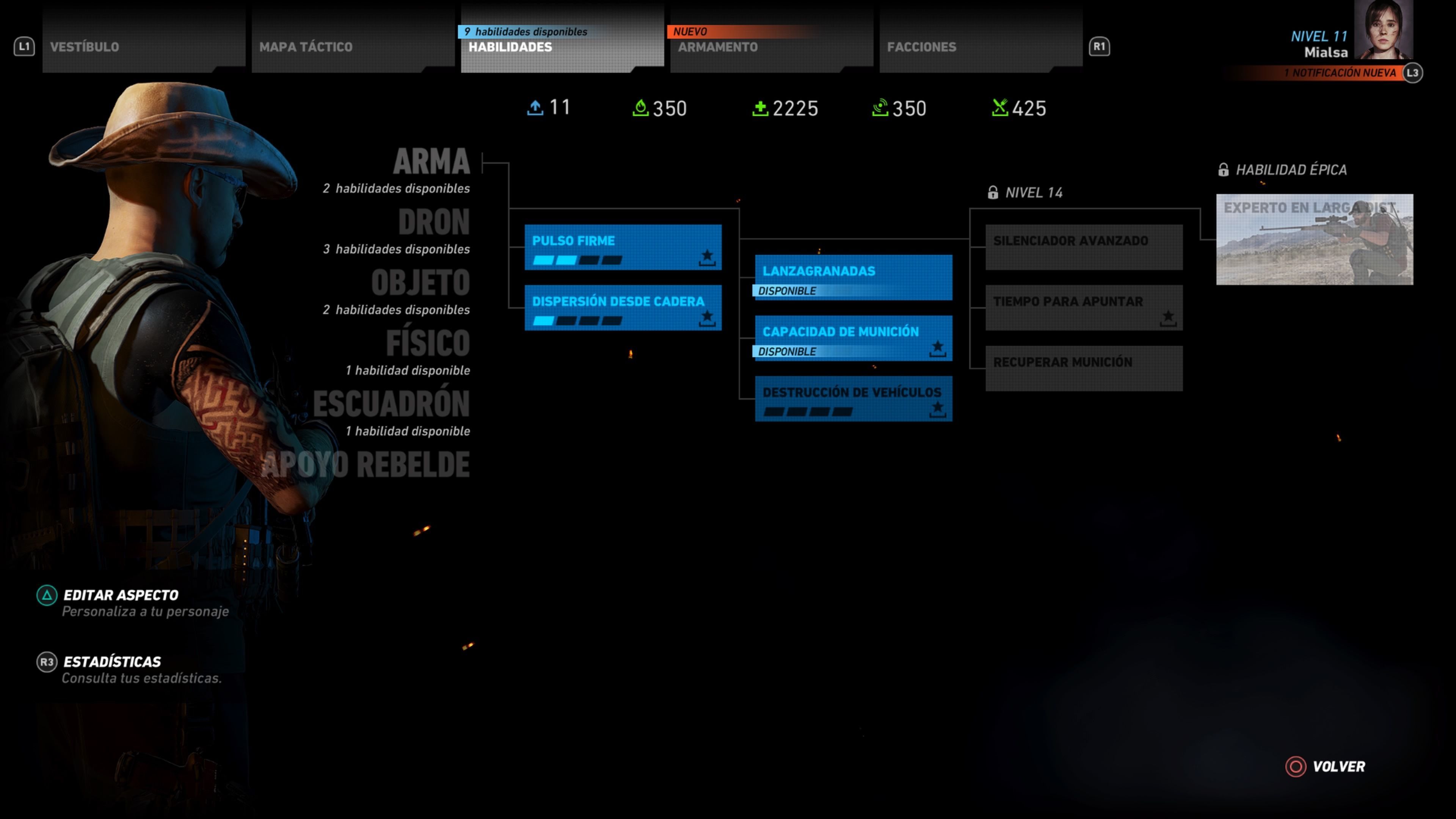 En total existen 6 ramas de habilidades: Arma, Dron, Objeto, Físico, Escuadrón y Apoyo Rebelde.