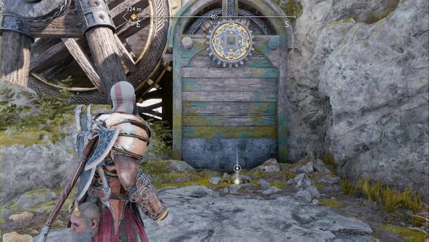 Ahora date la vuelta. Verás una roca que puedes destruir con la lanza, hazlo. Rodea el final del sendero, tira de la cadena, lanza una flecha sello al engranaje y luego el hacha, para congelarlo. Ahora, rapidamente, desanda el camino, usa el enganche para saltar, invoca el hacha y congela el géiser para que no se mueva la rueda de agua. Podrás pasar por el enganche, invocar el hacha, subir y eliminar enemigos antes de avanzar.
