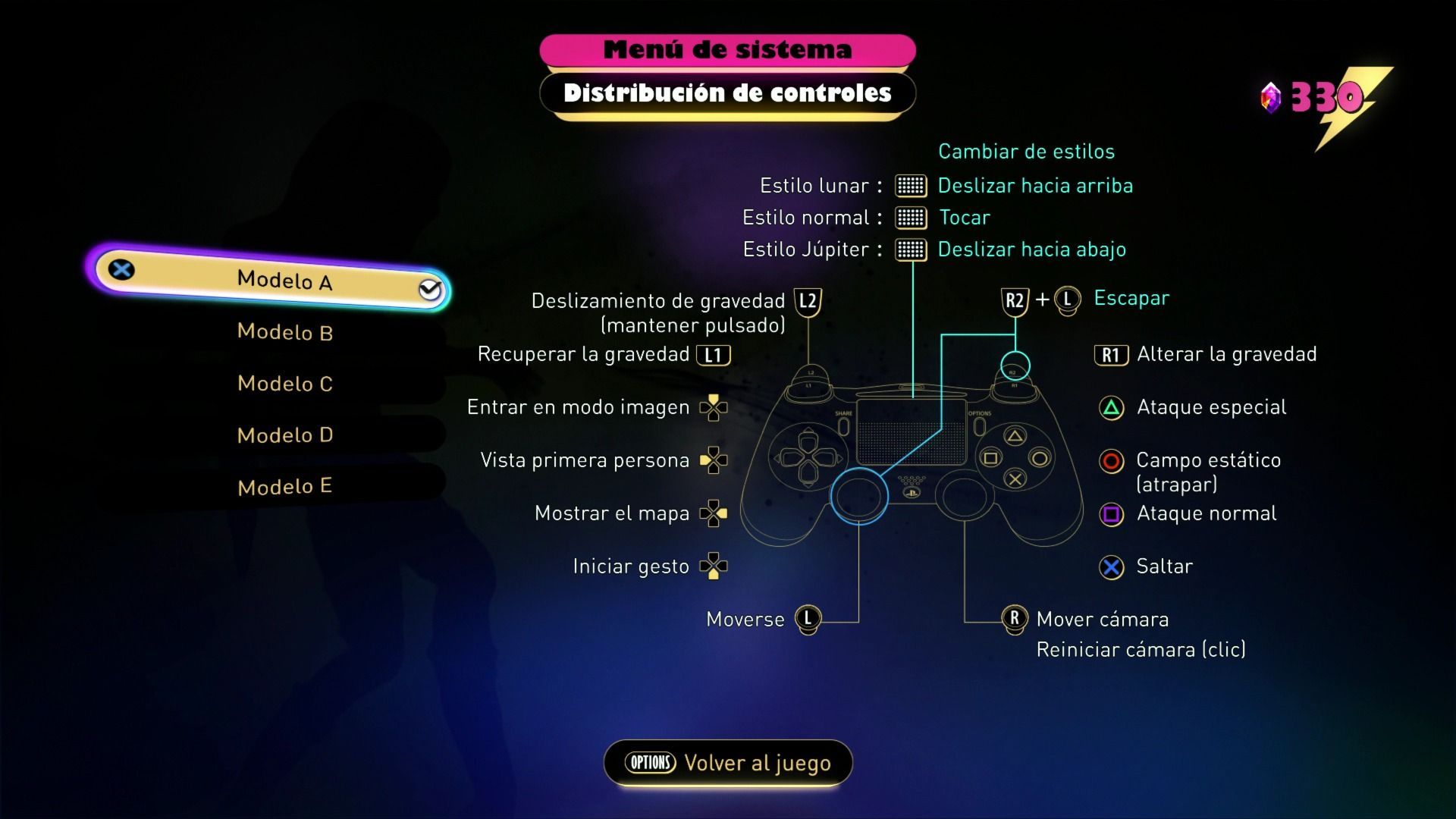 Se trata del estilo normal, el que tenemos desde el principio de la aventura, estilo lunar y estilo júpiter, y cuando tengamos los tres podremos intercambiarlos pulsando en el panel táctil del mando.