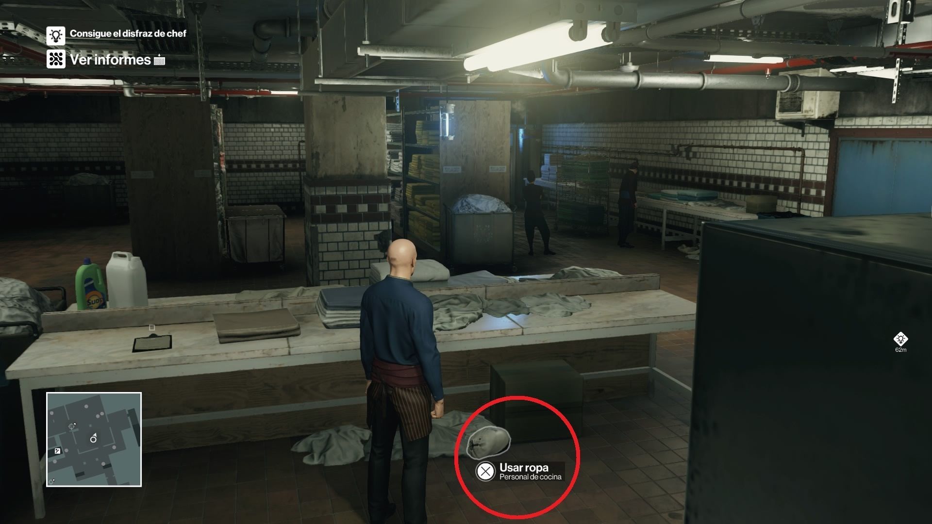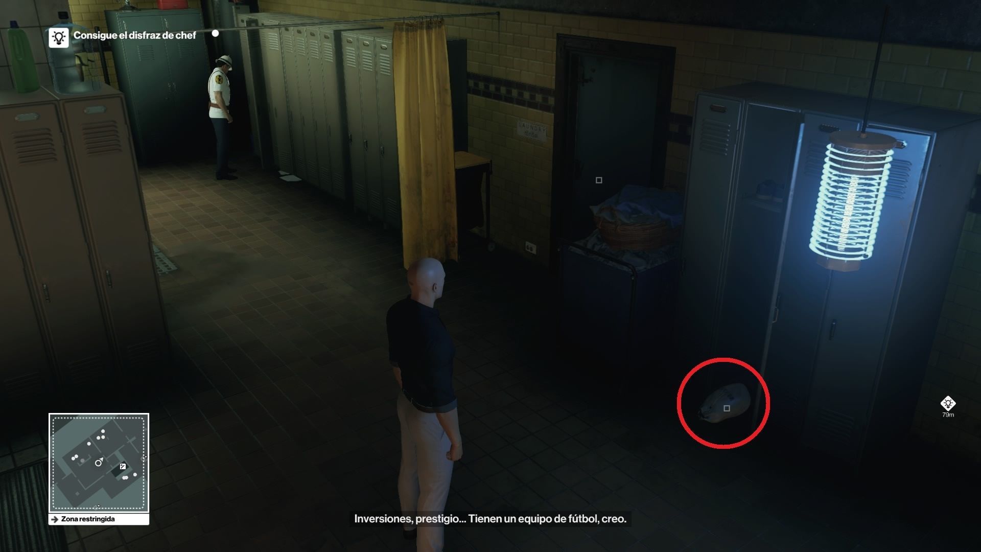 Dirígete a la izquierda del muelle y, cuando nadie te vea, entra por la puerta que lleva al sótano del hotel. Sigue recto y avanza agachado y sigilosamente para que no te detecten las mujeres que están hablando en la siguiente zona. Sal por la derecha y entra por la primera puerta a tu izquierda. Estarás en los vestuarios. Cámbiate con la ropa de camarero que hay delante de ti.