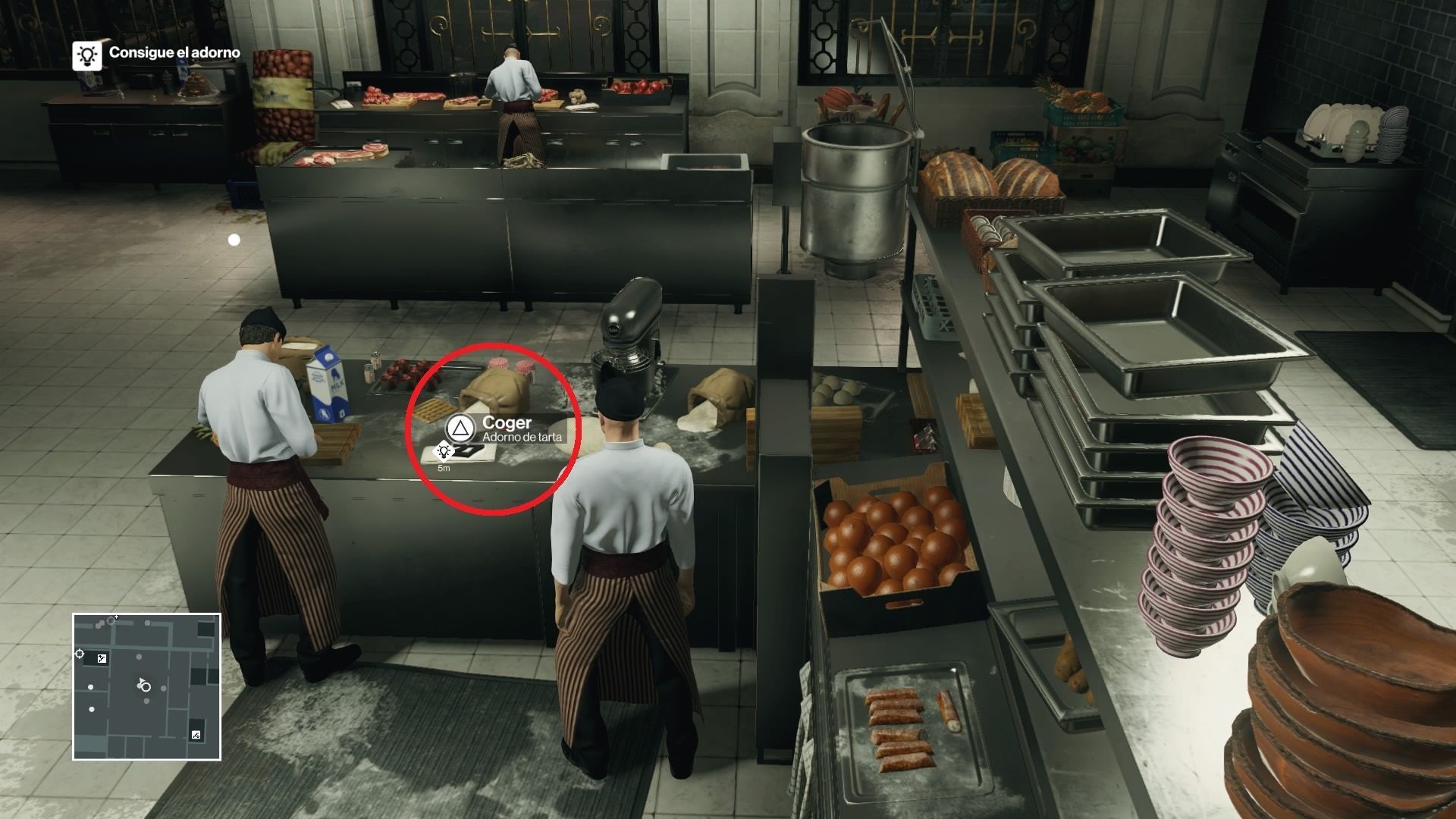 Regresa a la parte trasera de la cocina, sal por la puerta y sube por las escaleras de la izquierda. Llegarás al pasillo que hay al fondo de la recepción. Síguelo hasta el otro lado, donde hay dos guardias, y sube hasta el nivel 3 del mapa. Entra en la primera habitación de la izquierda y pon el adorno en el pastel.
