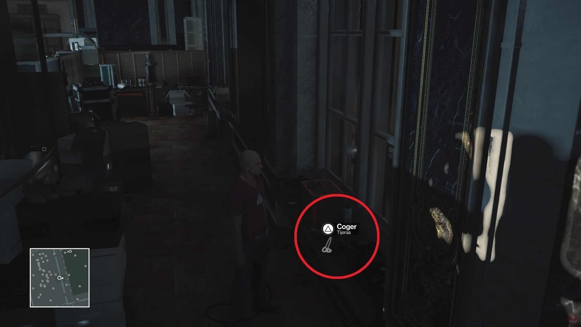 En planificación de la misión cambia la ubicación inicial a infiltrado en el camerino. Encontrarás las tijeras en uno de los rincones de la sala, donde uno de los estilistas habla por teléfono.