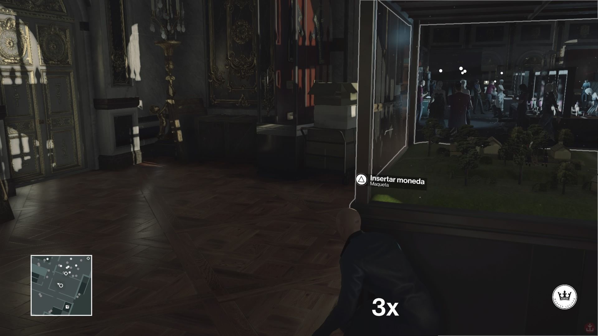 En la planificación, ponte la jeringuilla con veneno letal en el equipo. Desactiva primero las grabaciones de las cámaras y ve a por Helmut Kruger. Con su disfraz, regresa al camerino por la parte de atrás y escóndete detrás de la maqueta. Lanza una moneda cerca de la caja para llamar la atención de Sebastian.